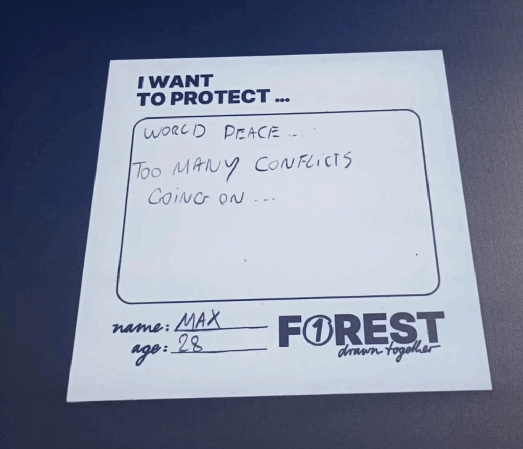 Toch wist Vettel hem ditmaal te prikkelen. Verstappen tekende zijn boom en beantwoordde een extra vraag die Vettel aan de coureurs stelde: “Wat zou jij willen beschermen?”